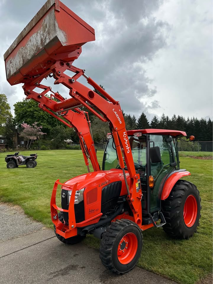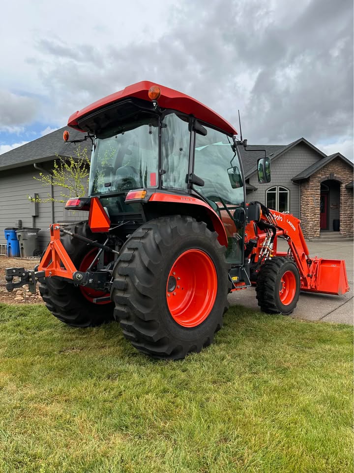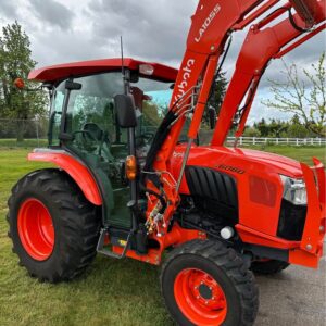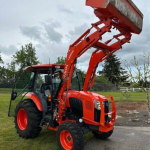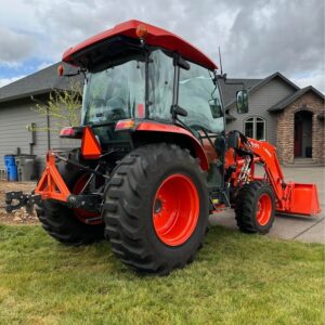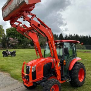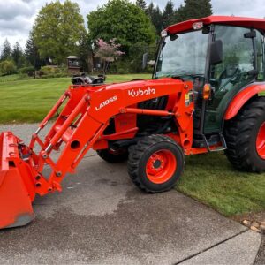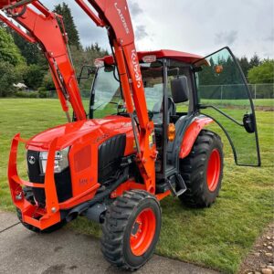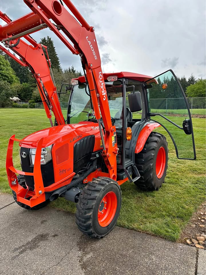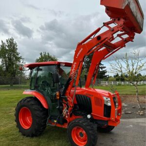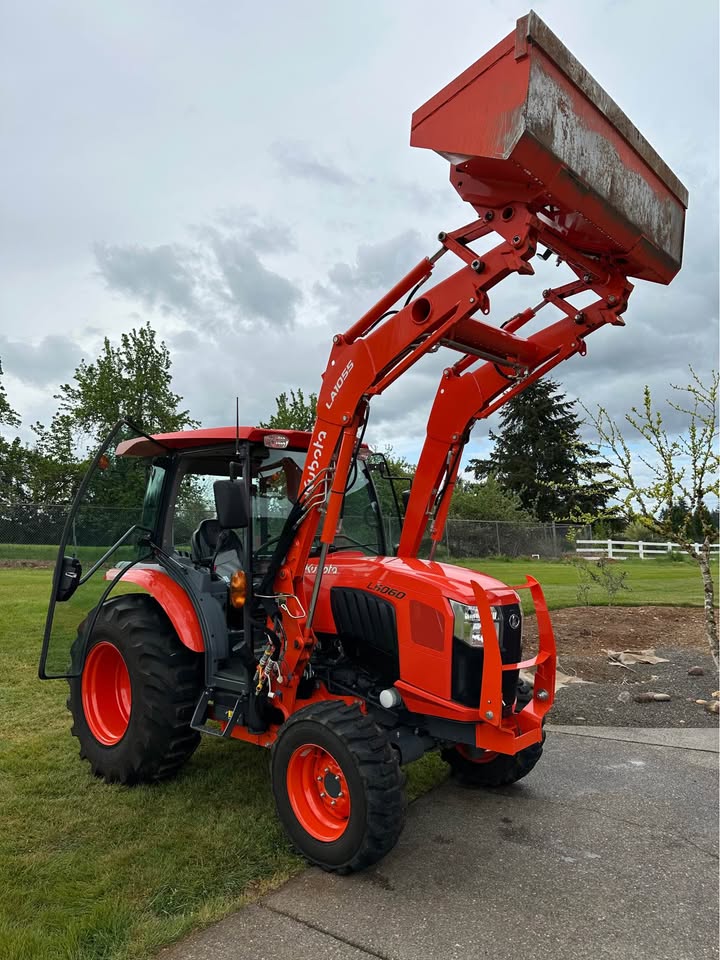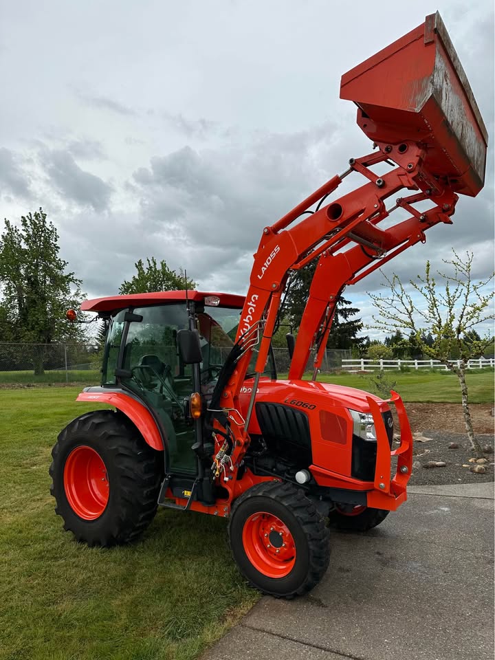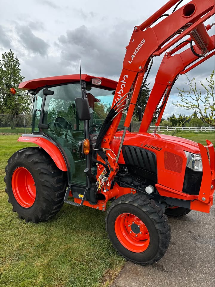 2021 Kubota L6060HTSC Tractor w/Front Loader. The tractor is in excellent condition and was used on my property for light residential work (moving rocks, dirt, brush cutting). I purchased the tractor new from Linn Benton in Tangent, Oregon on 5/15/21. The tractor has 106hrs and has been stored indoors since new. The tractor also comes with a LA1055 loader, 72″ bucket (L2235A), R4 tires (10-16.5 and 17.5L-24), grill guard, 2-level quick attach, and 3pt towing hitch on the rear PTO. The enclosed cab has full A/C and heat, radio w/bluetooth, adjustable seat and steering column, and lights.
