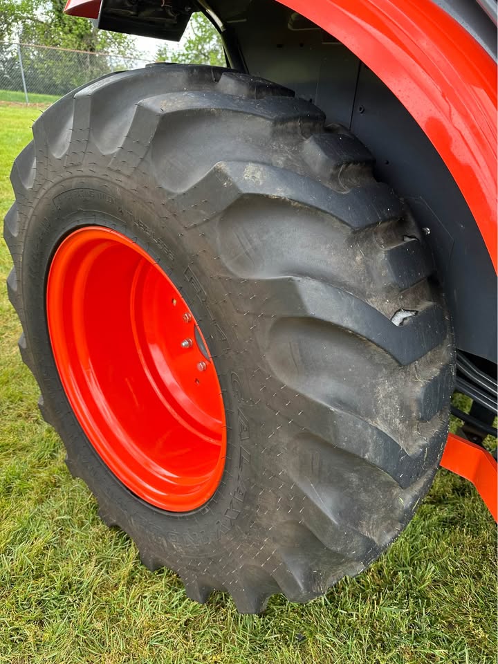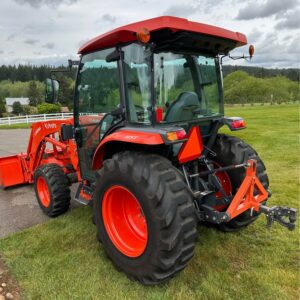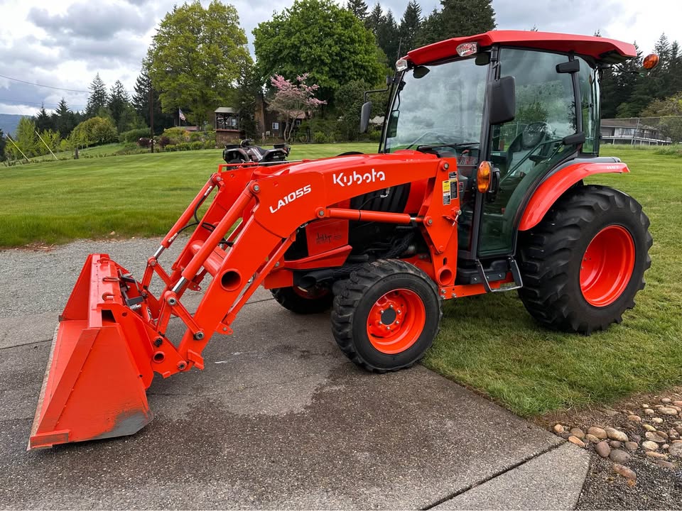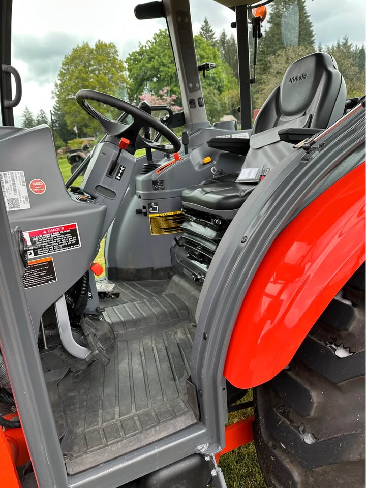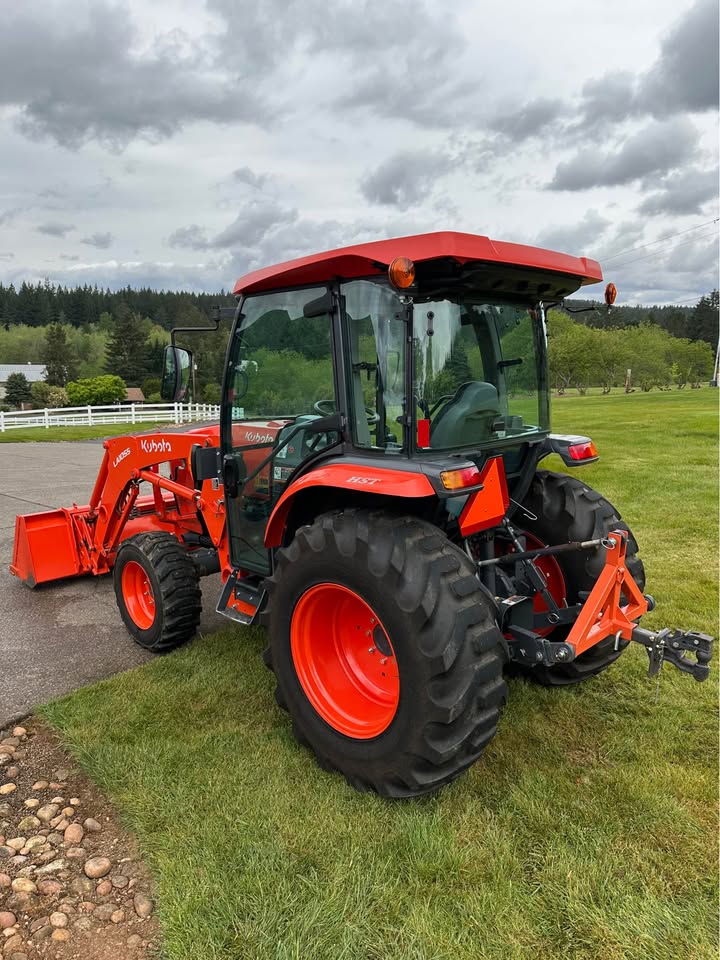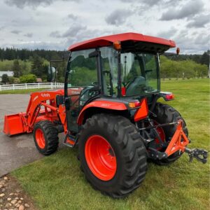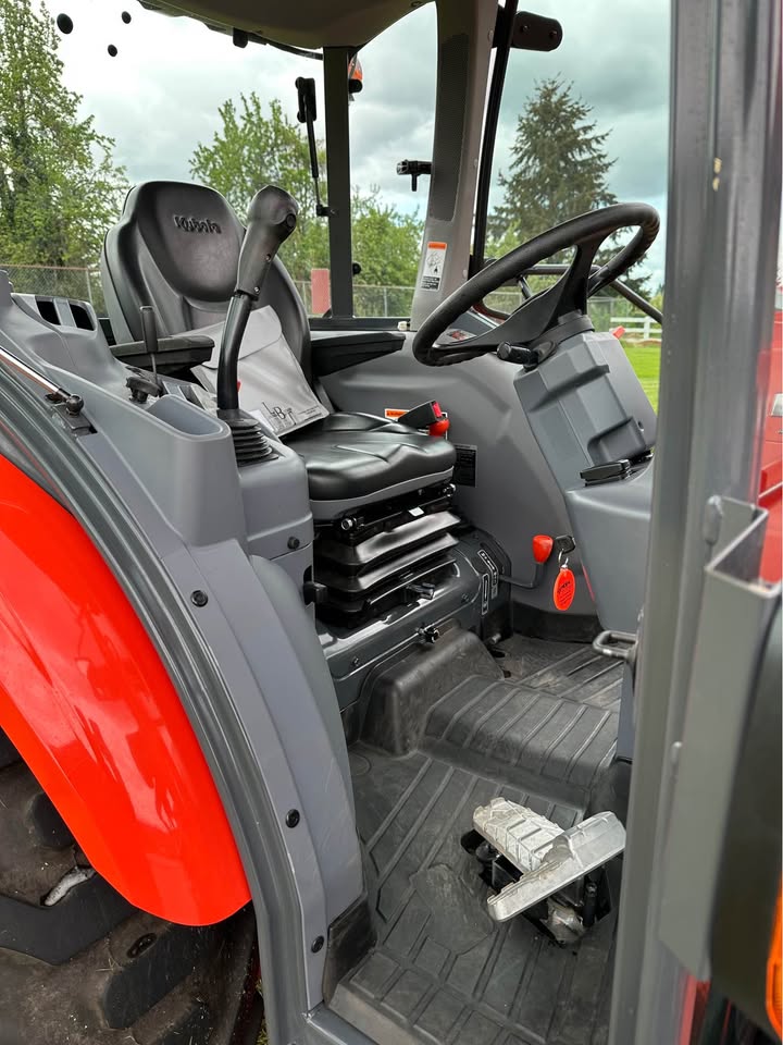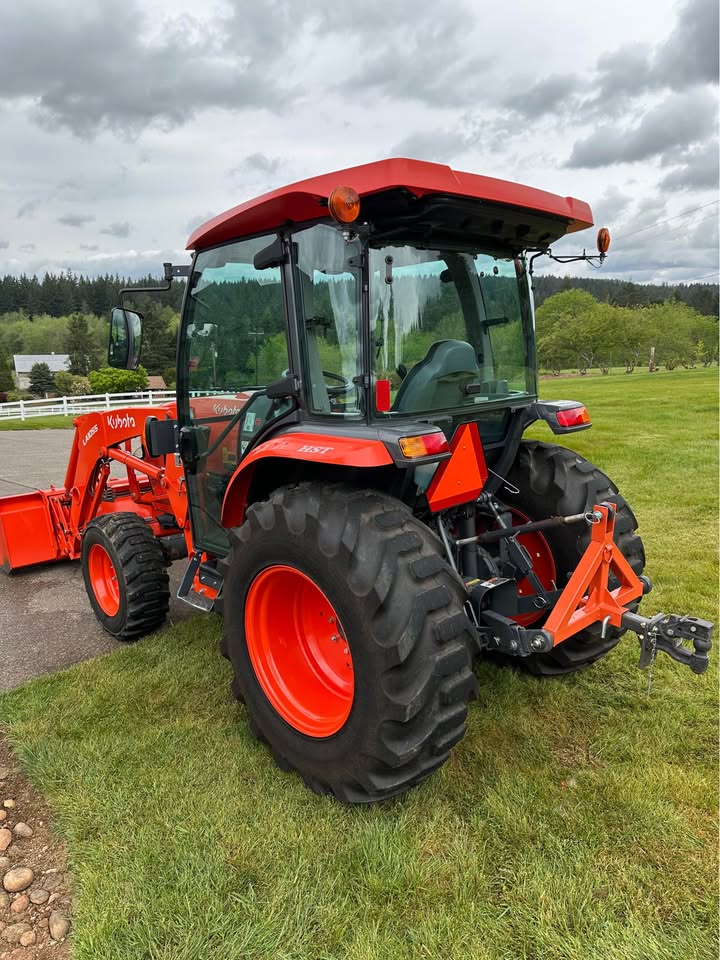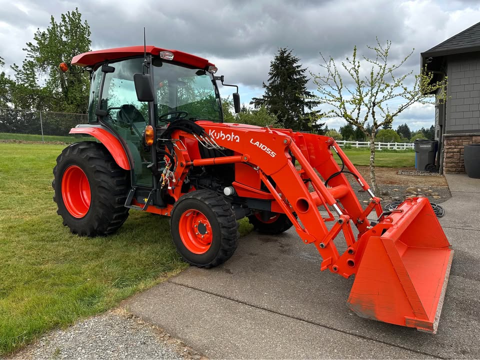 2021 Kubota L6060HTSC Tractor w/Front Loader. The tractor is in excellent condition and was used on my property for light residential work (moving rocks, dirt, brush cutting). I purchased the tractor new from Linn Benton in Tangent, Oregon on 5/15/21. The tractor has 106hrs and has been stored indoors since new. The tractor also comes with a LA1055 loader, 72″ bucket (L2235A), R4 tires (10-16.5 and 17.5L-24), grill guard, 2-level quick attach, and 3pt towing hitch on the rear PTO. The enclosed cab has full A/C and heat, radio w/bluetooth, adjustable seat and steering column, and lights.